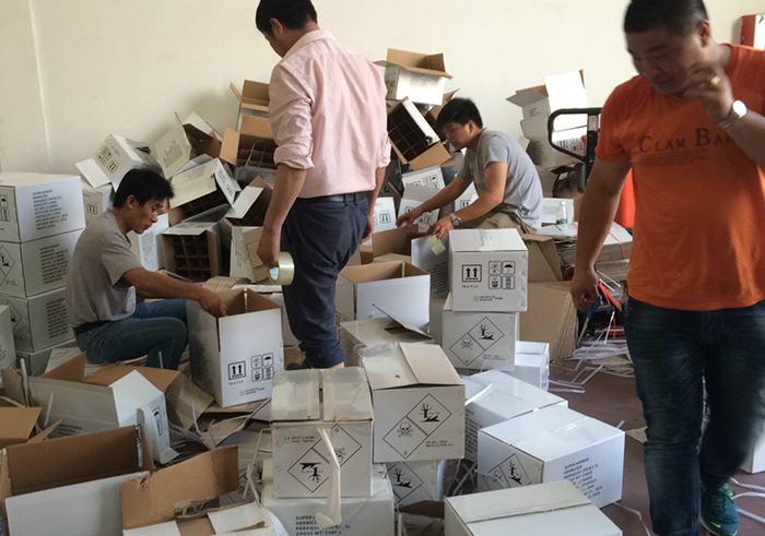 為排除危險品安全隱患,讓客戶如期履行合同宗旨,維護中國出口形象。圖為上海港口某貨代倉庫,由于環境等不可抗力因素,加上保管疏忽,導致部分貨物和包裝受潮破損。眼看船期臨近,我們公司接到客戶緊急電話,需要12小時以內生產一批補給包裝發往事發地,時間短、任務重、難度大,同時也考驗著公司的硬件實力和機動能力。